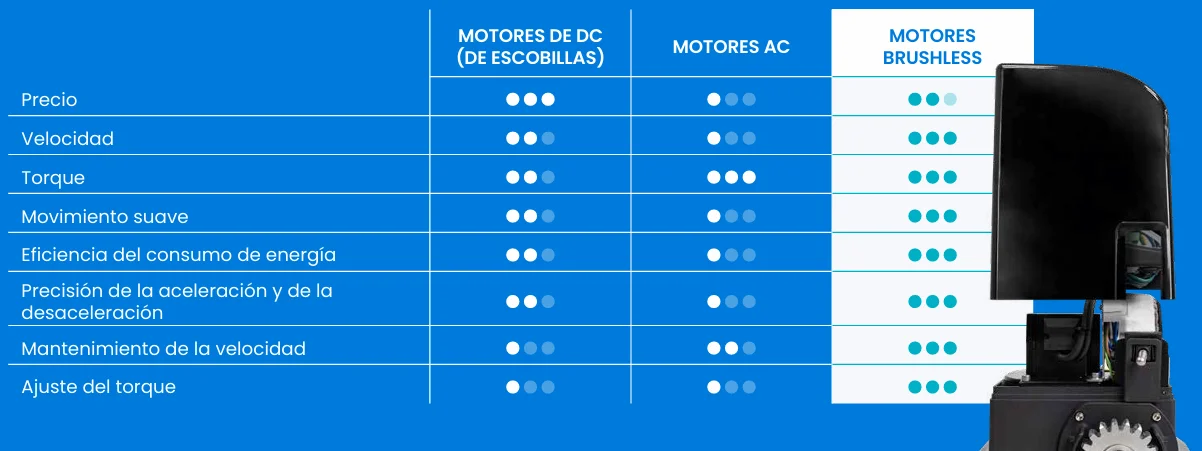Motor elĂ©ctrico con tecnologĂa Brushless sin escobillas y engranajes lubricados.
