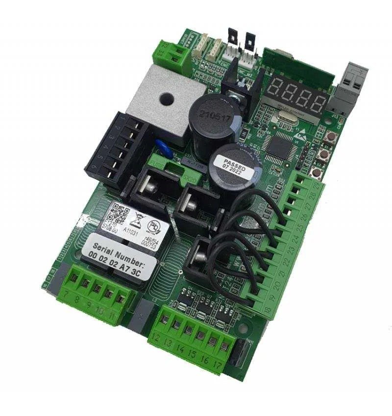Este cuadro permite una configuración rápida y sencilla en un solo paso, adaptándose automáticamente al tipo de motor instalado, ya sea para puertas correderas, batientes, basculantes, barreras, seccionales o pilonas. Viene preconfigurado de fábrica para puertas batientes, garantizando una puesta en marcha eficiente.
