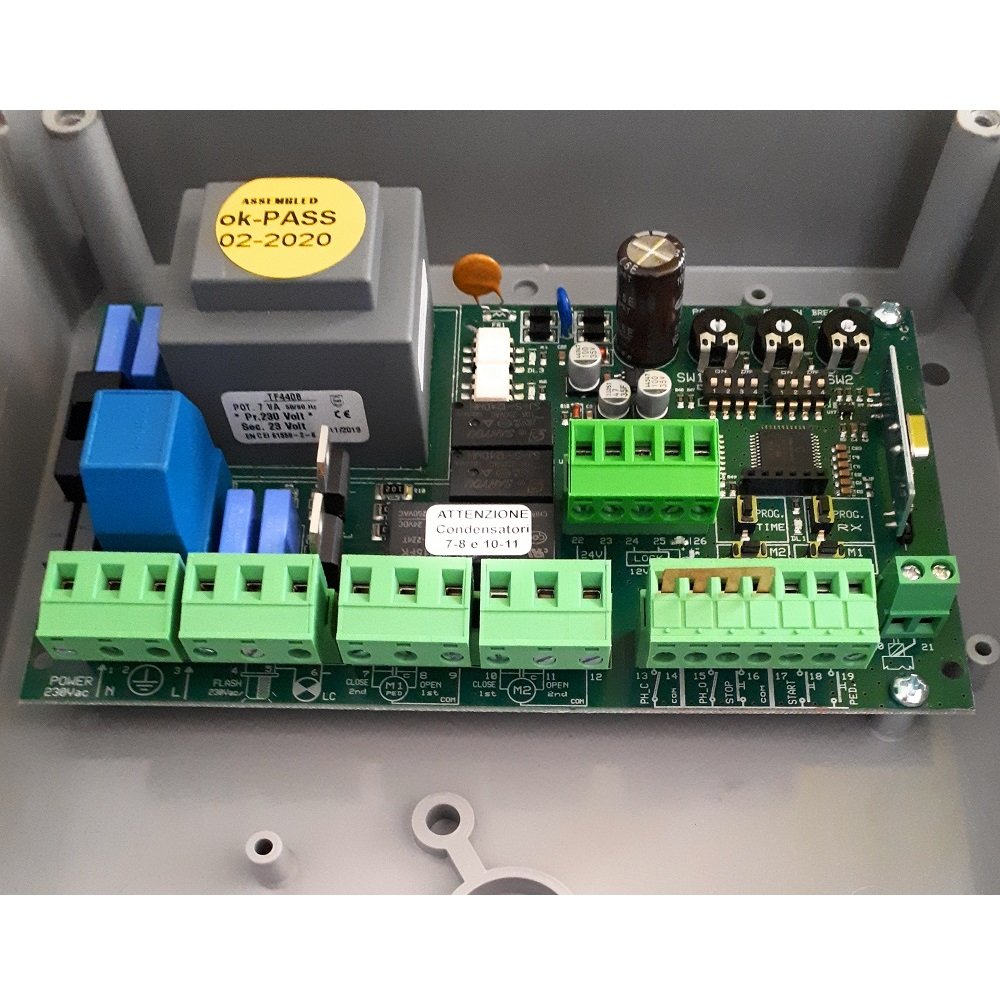 Placa de control para gestión de 1 o 2 motores de puertas abatibles, corredera, basculante, enrollable, etc.. con motores a 230v.